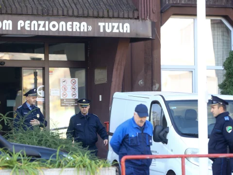 Police officers stand in front of a retirement home following a major fire that killed 11 and injured 30 people,…