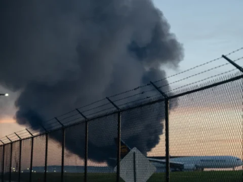 A UPS Boeing 737 is seen parked while a plume of smoke from the nearby UPS cargo plane crash is…