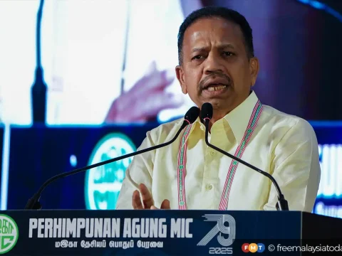 Presiden MIC SA Vigneswaran (kanan) bersama timbalannya M Saravanan, perhimpunan agung parti itu hari ini. SHAH ALAM: Konvensyen tahunan MIC…