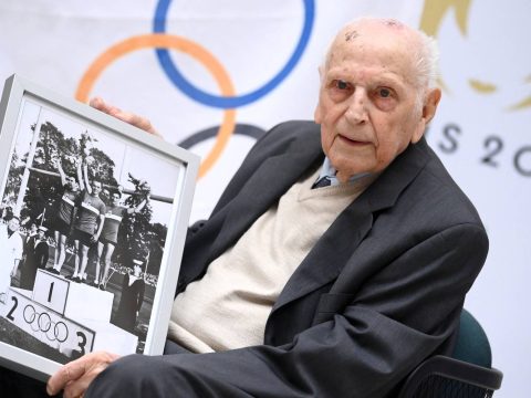 French cyclist and Olympic champion Charles Coste poses with a photograph of his team pursuit victory at the 1948 London…