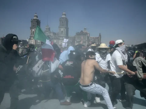 Protesters attempt to tear down a fence during a demonstration near the National Palace in Mexico City. (EPA Images pic)…