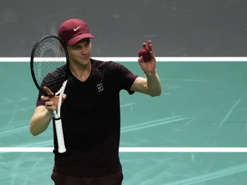 Italy’s Jannik Sinner celebrates after winning against the US’s Ben Shelton at the Paris ATP Masters 1000 tennis tournament. (AFP…