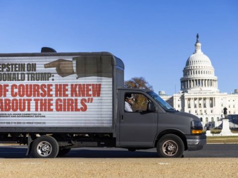 A protest truck drives past the US Capitol ahead of a House vote on whether to release the so-called Epstein…