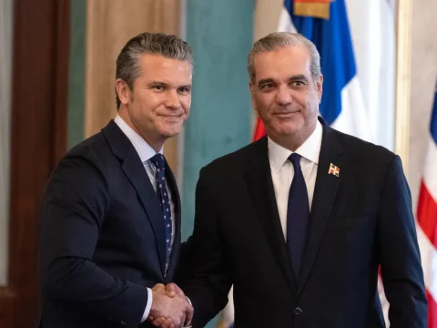 Dominican Republic President Luis Abinader shakes hands with US secretary of defense Pete Hegseth at the National Palace in Santo…