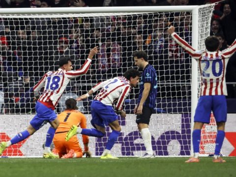 Atletico Madrid’s Jose Maria Gimenez (centre) celebrates after scoring in the 93rd minute against Inter Milan at the Metropolitano Stadium….