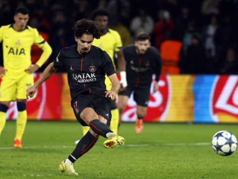 PSG’s Vitinha slots home a penalty for the fifth goal in the win against Tottenham Hotspur at Parc des Princes….