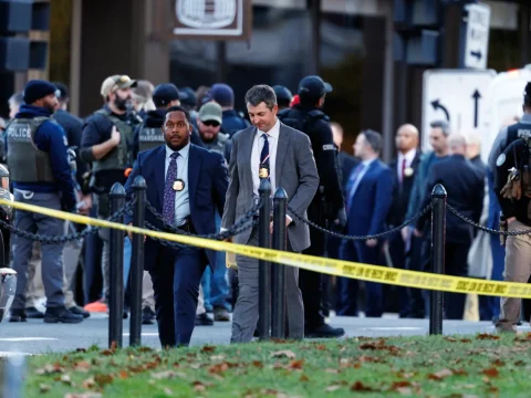 Law enforcement officials stand close to the scene where two national guard members were shot in Washington. (EPA Images pic)…