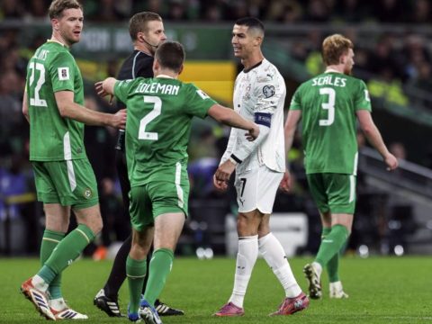 Cristiano Ronaldo (centre) was sent off in Portugal’s penultimate qualifying match against Ireland in Dublin for an elbow in the…