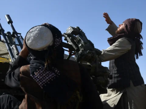 A file photo shows armed Taliban personnel watching the sky for Pakistani airstrikes. Islamabad accuses the Taliban of sheltering militants…