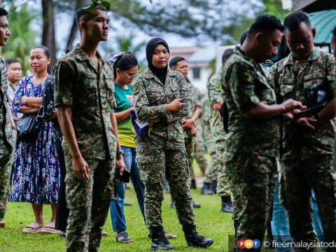 Military personnel and their spouses waiting to cast their votes at Markas 5 Briged, Lok Kawi, in Sabah, today. PETALING…
